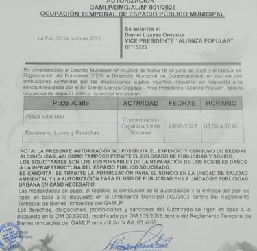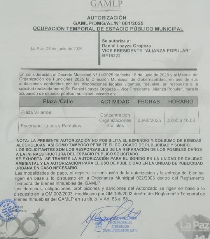 Con esta disposición, el municipio paceño garantiza el marco legal para el desarrollo del acto político, que marcará el inicio oficial de la campaña electoral de Alianza Popular, en coordinación con las organizaciones sociales agrupadas en el Pacto Popular.